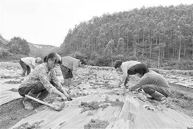 港南区大古碑中草药种植专业合作社在该区木梓镇红朗村有100多亩中药材基地,依托土地资源优势和良好的气候生态环境,大力发展适合本地种植的藿香等各种中药材产业,今年开始首次尝试土地轮种紫苏70多亩,通过轮种的方式来调节土壤肥力,提高土地利用率,从而实现增产增收,该批紫苏将于8月上市,预计亩产量可达1500公斤。该图为4月4日,基地工人正在种植紫苏。 (见习记者林子棠摄)