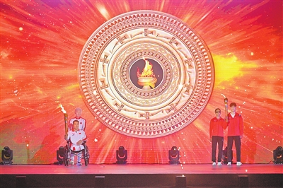 最激动人心的是点火仪式。火炬手刘翠青是中国残疾人田径队运动员,南宁姑娘,第15届里约残奥会田径女子T11级400米冠军,第16届东京残奥会田径女子T11级400米、200米冠军,同项目世界纪录保持者。她虽然看不见今晚的盛况,但听得到现场沸腾的掌声。她点燃了火炬手吕兴池手中的火炬。吕兴池是贵港人民的骄傲,荷城“大力士”,广西残疾人举重队运动员,全国第十一届残运会举重男子65公斤级亚军获得者。当象征着拼搏、荣誉的运动之火点亮贵港的夜空时,现场掌声雷动。