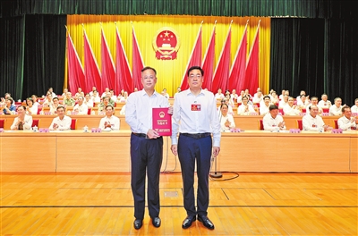 朱会东为新当选的市人民政府市长林海波颁发当选证书。