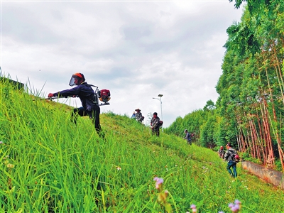 覃塘区平龙水库管理中心加强水库坝区管理,定期组织人力修整主、副坝绿化地带。图为8月24日,该管理中心组织员工割除水库一副坝护坝坡的杂草。(记者张日芳摄)