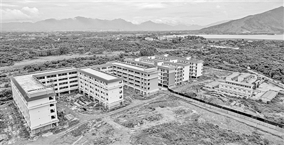 平南县官成镇第二初级中学迁建项目新建5层教学综合楼三幢、3层食堂一幢、5层学生宿舍楼三幢,新建跑道及体育场等配套设施,项目建成后可容纳2400多名学生。目前,该项目中间2栋楼已交付使用,另外4栋楼主体已竣工,正在做室内装修,预计年底可交付使用。图为8月30日拍摄的项目现场。