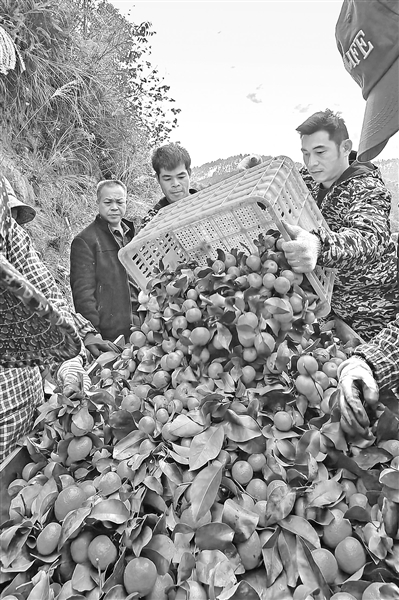 在木梓村甘察屯种植基地,果农来回穿梭在砂糖橘树之间,采摘、搬运、分拣、装箱、装车,每一个环节都有条不紊地进行着。