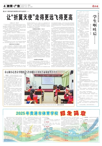 “针对高中阶段和学前特殊教育资源严重短缺的情况,我市将抓住贵港列入国家特殊教育改革实验区的契机,通过‘建、造、转、设’的办法,建立从学前到高中阶段全学段衔接的特殊教育体系。”项晓表示,3年实验改革将积极发展学前特殊教育,着力发展以职业教育为主的高中阶段特殊教育,推进特殊教育资源“向两头延伸”,扩充学前和高中特教学位供给。