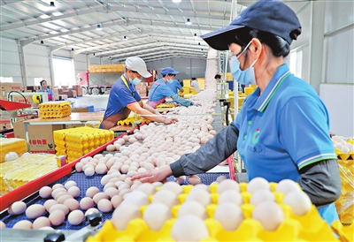 位于港南区东津镇的广西华兴禽业有限公司200万羽蛋鸡项目计划总投资3.2亿元,达产后年可供应3.2万吨新鲜鸡蛋、3万吨有机肥,年产值3.5亿元,可长期解决150多人就业,带动500户农户持续增收。目前一期项目4栋鸡舍已投产,存栏蛋鸡40万羽,日产鸡蛋38万枚。图为3月14日,工人正在分拣鸡蛋。