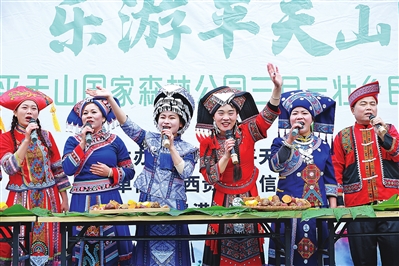 3月29日至4月1日,广西平天山国家森林公园举办“广西三月三·乐游平天山”鼓舞、竹竿舞、扁担舞、山歌对唱等活动,让游客感受广西传统文化的乐趣。图为山歌对唱活动现场。全媒体记者郭晓枫摄