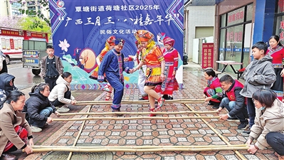 3月29日,覃塘区覃塘街道荷塘社区举办“广西三月三·八桂嘉年华”民俗文化活动。活动现场,文艺汇演、山歌联唱、竹竿舞等节目精彩纷呈,各种特色美食让人流连忘返。图为游客在跳竹竿舞。全媒体记者杨小露 通讯员李桂新摄影报道