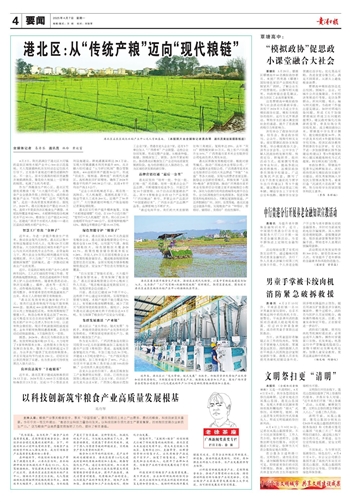 港北区以“龙头带动,链式发展”为抓手,积极将资源优势向产业优势和经济优势转化,不断探索培育新质生产力,做强做大粮食加工产业。