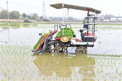 记者现场看到,李欣财驾驶插秧机摆好位置,插秧机便缓慢走动起来,他便到放置秧苗的地方查看秧苗使用情况,发现空缺及时添加,插秧机自行往前走,走一趟就均匀地插下8列笔直的秧苗。