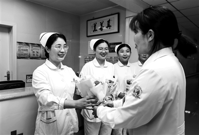 5月10日,在山东省枣庄市精神卫生中心,医生给护士献花。