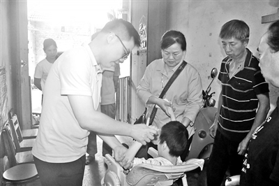 从才才家告别出来后,杨振新和胡智权又赶往金田镇,那里有11个家庭的患儿在翘首以盼。金田镇4岁的贵贵(化名)长得白白净净,但嘴角流着口水,四肢蜷缩着,无法正常伸展。胡智权仔细地为贵贵进行检查,初步判断贵贵是因出生时黄疸未及时治疗,导致神经系统损伤和肌张力异常,需要到医院做进一步详细检查。