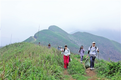 近日,我市户外爱好者自发组织“净山行动”,将散落在山间的瓶子、塑料袋等垃圾打包背下山处理,用实际行动保护大自然。图为户外爱好者在覃塘区黄练镇镇龙山捡拾垃圾。全媒体记者郭晓枫摄