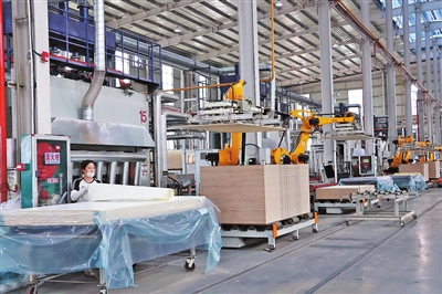 广西迈柏装饰材料制造有限公司年产生态板材800万张项目位于覃塘区国际绿色家居产业园,总投资2.5亿元,主要建设家具生产车间及配套设施等,目前已经完成6栋厂房及宿舍楼、办公楼建设,自动化生产线正在调试生产。项目全部建成达产后,预计年产值约2.2亿元。今年1—4月,该公司完成工业产值0.2亿元。图为6月11日拍摄的公司生产车间一角。全媒体记者杨小露摄