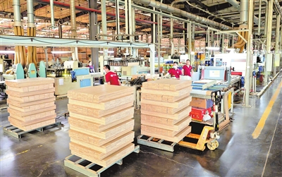 近年来,港南区木业产业聚焦产业提档升级、新产品研发、新技术应用等方面发展,通过“走出去、请进来”的办法,不断提升木业产业在全国的影响力和市场占有率。目前,港南区木业企业由2006年的30多家发展到1400多家。今年第一季度,港南区规模以上木业企业307家,占该区规上工业企业数量的77%;总产值49.2亿元,同比增长13.6%。图为近日,工人在贵港汉邦木业有限公司生产木地板。全媒体首席摄影记者张庆杰摄