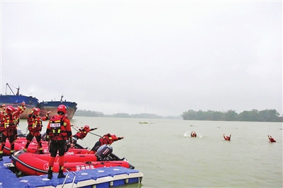 6月16日至17日,市防汛抗旱应急抢险中队在覃塘区石卡镇樟竹码头开展水域救援技能培训演练。演练模拟城市内涝、洪涝灾害、人员溺水等多种复杂水域险情下,救援人员如何开展救援。图为救援技能培训演练现场。
