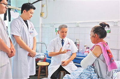 “王医生,我的手还能恢复吗?”55岁的周华英从楼梯上摔下来导致左肱骨髁间粉碎性骨折,术后疼痛难忍,情绪低落。每天查房时,王辉都会帮助她做握拳和摆手练习,用已康复出院的患者案例鼓励她:“你看这位阿姨,年纪比你还大,术后3个月后就能正常生活了。”听了这话,周华英充满了信心,积极配合护士换药、做康复训练,脸上重新挂上笑容。