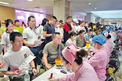 8月16日,贵港市中心血站联合贵港东晖医院开展无偿献血活动。本次活动计有东晖医院的员工、员工家属、患者家属,以及社会团体和热心市民共1779人献血,献血总量高达50.73万毫升。图为活动现场。全媒体记者陆颖敏摄