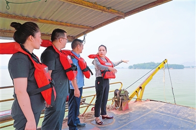 8月14日,覃塘区人民法院与覃塘生态环境局、覃塘区水利局、覃塘区蒙公镇人民政府组成联合巡查队,对辖区内重要饮用水水源地平龙水库开展巡查普法活动,通过乘船查看水库周边生态环境、开展入户普法宣传等,进一步强化水库生态环境保护与治理,提升群众法治意识,以司法力量保障饮用水源安全。图为联合巡查队乘船查看平龙水库周边生态环境。