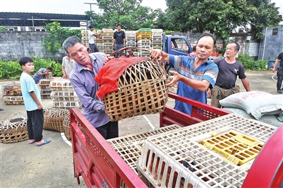 8月18日,港北区残联联合港北区增艺家禽养殖专业合作社等爱心企业向根竹镇、荷城街道、港城街道、大圩镇、庆丰镇、武乐镇、中里乡、奇石乡等乡镇(街道)的残疾受助对象发放鸡苗和鸡饲料等生产物品,并为残疾人提供养殖培训。图为残疾受助对象在领取鸡苗和鸡饲料。
