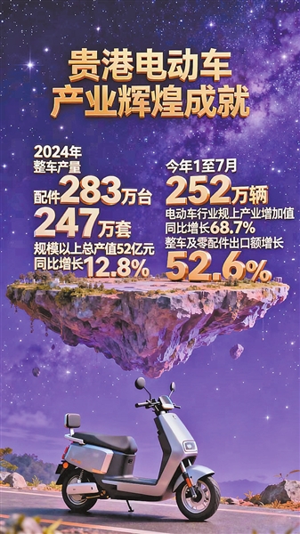 经过十年耕耘,贵港实现产业规模、产业链条、市场拓展、科技创新“四大突破”,成为中国第四大新能源电动车生产基地。2024年实现整车产量283万辆、配件247万套,规模以上总产值52亿元,同比增长12.8%。贵港市电动两轮车产业集群先后入选“工信部中小企业特色产业集群”“广西先进制造业集群”;今年1至7月再创新高,整车产量252万辆,电动车行业规上产业增加值同比增长68.7%,整车及零配件出口额增长52.6%,“好电车 贵港造”品牌走向世界。