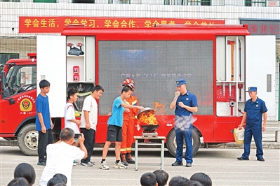 近日,港南区新塘镇第三初级中学的操场上惊呼声此起彼伏,一堂别开生面的消防课正在这里紧张进行。