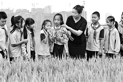 10月15日,江苏省太仓市港城小学老师为孩子们讲解水稻生长知识。
