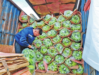 10月16日,平南县上渡街道河口村香蕉种植基地内,工人打包装车。该基地香蕉种植面积125亩,预计总产量42.5万公斤,年产值可达220万元,产出的香蕉主要销往粤港澳大湾区。全媒体记者杨小露 通讯员杨嘉琪摄影报道