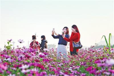 连日来,我市天气晴朗,暖阳融融,市民纷纷走出家门,前往各大景区和特色景点游玩打卡,共享美好时光。图为1月1日,市民在郊外西江农场一片盛开的格桑花海中拍照留念。