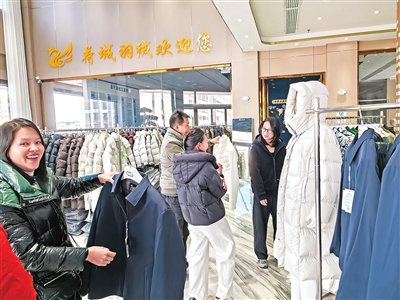 广西荷城羽绒有限公司是由贵港市亨利来羽绒制品有限公司打造的以从事皮革、毛皮、羽毛及其制品和销售为主的一家企业。图为1月3日,广西荷城羽绒有限公司展厅的销售场景。全媒体记者易舟琴摄