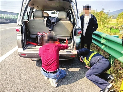 2月4日上午,在S40梧硕高速贵港北往覃塘收费站方向,一辆私家车因轮胎漏气故障临时停在应急车道上。市公安局交警支队春节安保巡逻组发现后,马上下车做好安全防护工作,并利用警车备用工具为群众更换车胎,让其继续探亲行程。图为民警更换轮胎现场。傅瑜摄