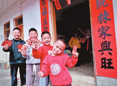 1月29日正月初一,平南县马练瑶族乡北胜村小朋友展示新年红包。全媒体记者张庆杰摄
