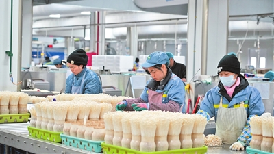 走进广西雪榕生物科技有限公司食用菌包装车间,只见一簇簇鲜嫩的金针菇紧密丛生,外观洁白、菇帽饱满,200多名工人在各自生产线上对其进行分拣、称重、包装等作业,现场忙碌而有序……