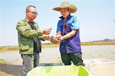 近年来,港南区东津镇雷村盘活土地资源发展蟹苗培育,去年以来,已出笼1.2万公斤3亿多只蟹苗,供应桂平市等地的养殖场,每公斤蟹苗价格800多元,经济效益显著。图为近日养殖户在察看蟹苗生长情况。刘志宁摄