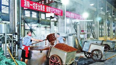 6月5日,广西乳泉酒业有限公司酿酒车间,酿酒师傅铆足干劲,挥动着手中的铁铲,专注完成每一道酿造工序,努力将自己的技艺融入乳泉井酒液中。全媒体记者杨小露摄
