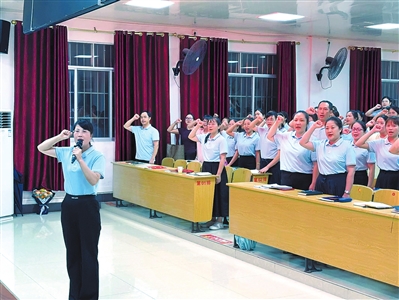 9月8日,贵港市达开实验小学举行教师节庆祝活动暨“青蓝工程”师徒结对仪式。图为全体教师进行师德师风宣誓。全媒体记者欧钰宇摄