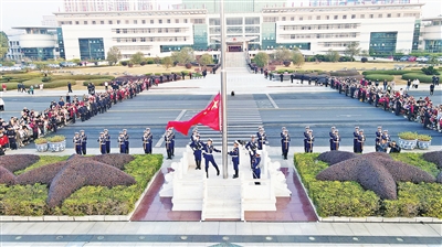 1月1日上午,我市在市区新世纪广场举行升国旗仪式。伴随着雄壮的国歌声响起,鲜艳的五星红旗冉冉升起,市民群众向国旗行注目礼,用真挚的感情为祖国献上新年的美好祝福。图为升国旗仪式现场。全媒体记者张庆杰摄