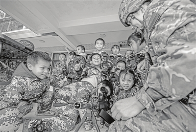 2024年12月29日,武警广西总队贵港支队组织80余名小学生走进军营,通过观摩军事训练、参观内务设置、体验武器装备等形式体验军营生活,把维护国家安全的“种子”种在了一颗颗童心之间。图为小学生体验武器装备。