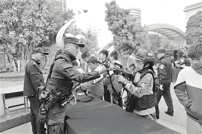 近日,贵港市少年警校荷城小学教学点揭牌仪式暨警营开放日活动在港北区荷城小学举行。活动期间,文艺汇演、警体拳和警犬表演轮番上阵,赢得师生阵阵欢呼声和掌声,现场还设置警用装备展示和普法宣传等区域,引导广大青少年做平安建设的传承者、法治思想的传播者和公平正义的守护者。图为活动现场。李丽摄