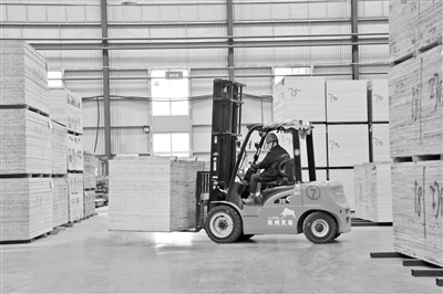 近年来,港南区木业企业通过技术改造不断延伸企业产业链,产品从最初的单板、建筑模板等普通板材,逐步向家具板、护墙板、木地板、装修板、板式家具和家具辅助装饰材料等高附加值产品发展,木材加工产业已成为该区优势产业。图为记者近日拍摄的港南区新塘产业园广西荣登堡木业有限公司生产车间一角。