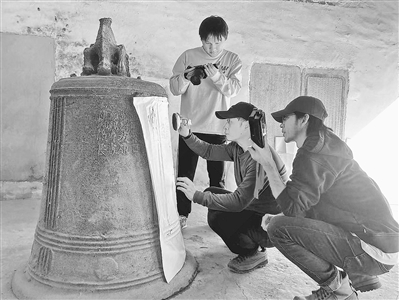 1月3日,广西宗教活动场所文物古籍保护信息化工作在我市南山寺启动,文物古籍保护工作者对南山寺现存的古代石刻、碑文等文物、古籍进行信息化处理。图为文物古籍保护工作者拓印南山寺明代铁钟上的文字。