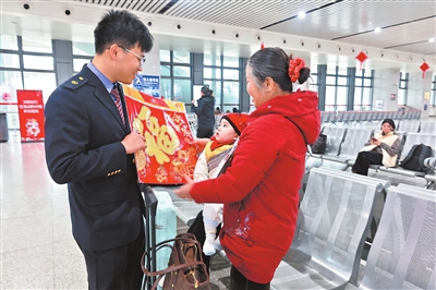 “这个拓印红包真好看,谢谢车站工作人员送的礼物,感觉像回到家一样亲切。”许晴手里拿着福字和印着“蛇年大吉”的红包,开心地在站内拍照留念。