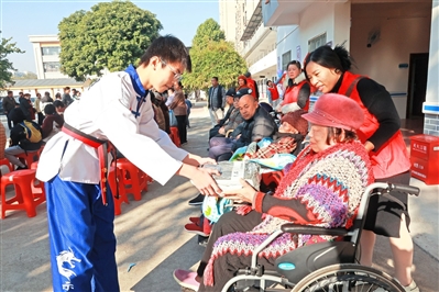 1月12日,我市一批爱心人士到港北区西江街道综合养老服务中心开展敬老暖心服务,与40余名老人一起包饺子、话家常、做游戏,为他们送上新衣服等爱心物品,让老人感受到来自社会的关爱和温暖。图为爱心单位表演者为老人送上新衣服等爱心物品。