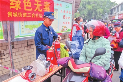 1月8日,港北区消防救援大队联合贵城街道、消防志愿者到农贸市场以设宣传台、敲门入户、张贴海报等方式开展消防安全宣传,切实筑牢辖区消防安全防线。图为活动现场。