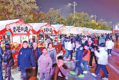 当晚7时许,随着锣鼓声响起,舞狮迎宾节目正式上演,活灵活现的表演吸引了周围群众迅速向舞台靠拢。紧接着,激情四射的开场舞、热血沸腾的少儿武术节目相继登场,给人带来强烈的视觉冲击,把文艺演出推向高潮,现场掌声、欢呼声不断。活动现场还加入了汉服快闪节目,让市民群众在欢乐购的同时感受国潮的魅力。在互动游戏区域,猜灯谜、投壶、趣味套圈、红包垂钓等国风互动游戏,进一步丰富年货市集活动内容,让广大市民朋友趣味玩转年货大采购。