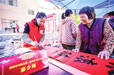 近日,港南区瓦塘镇开展“我们的中国梦——文化进万家”义务为民书写春联活动,10多位书法家现场挥毫泼墨。图为女书法家廖少梅正在写春联。