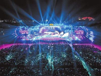 1月18日晚,“布山之夜”迎新春明星演唱会在覃塘区布山文化广场举行,多名歌手现场倾情献唱,另有音乐喷泉、布山古郡美食一条街等精彩活动,吸引2万多名观众前来观赏。图为鸟瞰视角下的多彩舞台。