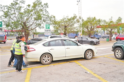 1月14日,由自治区高速公路发展中心主办,广西粤海高速公路有限公司承办的“情满旅途”学雷锋志愿服务活动在兴六高速贵港服务区北区启动。图为志愿者正在为旅客推抛锚的小轿车。全媒体记者樊奥星摄
