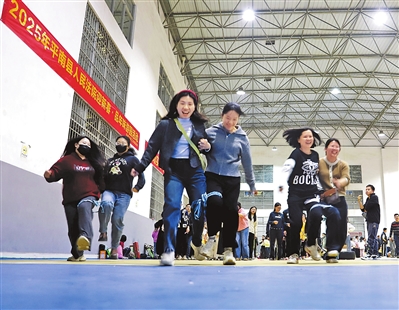 近日,平南县人民法院组织开展新春游园活动,设置有趣味投壶、两人三足、欢乐套圈、欢乐套鸭、幸运抽奖等游戏项目,既有速度与力量的角逐,又有耐力与技巧的较量,干警及其家属踊跃参与,祝福声、喝彩声、鼓掌声不断。图为两人三足现场。潘文华摄