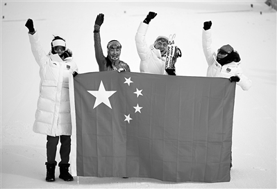 2月13日,中国队选手褚源蒙、孟繁棋、唐佳琳、文颖(从左到右)在赛后庆祝。当日,第九届亚冬会冬季两项女子4×6公里接力比赛在亚布力举行。中国队夺得冠军。新华社记者 伍志尊 摄