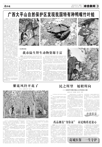 据悉,我市共记录有陆生野生脊椎动物4纲29目112科377种。其中两栖纲3目10科22种,爬行纲2目20科67种,鸟纲16目63科245种,哺乳纲8目19科43种。我市已记录的陆生野生脊椎动物中,国家一级重点保护野生动物有鼋、鳄蜥、彩鹮、东方白鹳、海南鳽、黄胸鹀、穿山甲、小灵猫、云豹、金钱豹、林麝等11种;国家二级重点保护野生动物有版纳鱼螈、虎纹蛙、大壁虎、眼镜王蛇、红原鸡、黑翅鸢、猕猴、豹猫等53种;广西重点保护野生动物有黑眶蟾蜍、泽陆蛙、舟山眼镜蛇、环颈雉、四声杜鹃、三宝鸟、北树鼩、鼬獾、赤麂等82种。