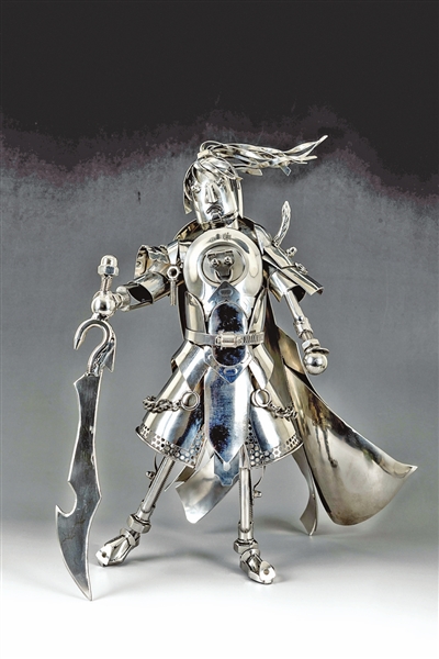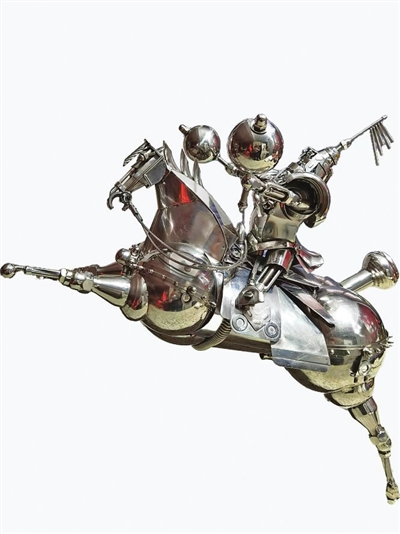 2017年,曾义注意到金属工艺在工艺美术中的稀缺性。他从唐太宗昭陵六骏石刻中获取灵感,在创作中大胆选用不锈钢建材零件和废弃金属。这些现代工业文明的产物,在他的手中获得了新的艺术生命。他将冰冷的金属材料转化为充满温度的艺术作品,通过精妙的组合与焊接,让每一块金属都找到了最恰当的位置。“骏马和武士的模型刻在我的脑海中,在生活中遇到废弃的金属材料,我就会思索,这些材料适合拼接在什么部位。”曾义说,他喜欢在早上和傍晚做金属工艺品,晨曦和黄昏不同的光线照射进工作室,常常给他带来很多灵感。